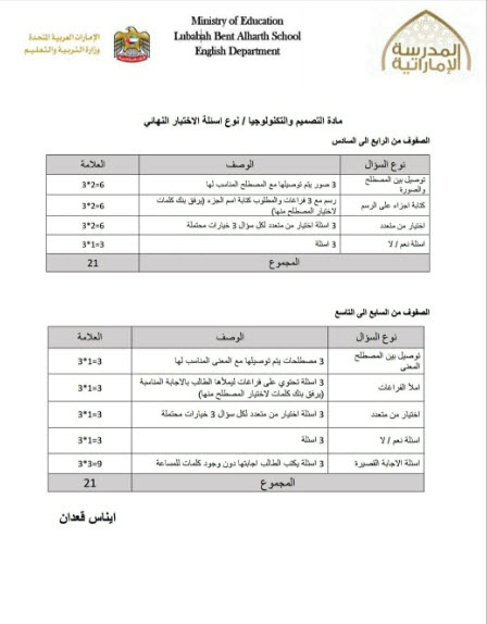 طريقة ونوع أسئلة الاختبارالنهائي لمادة التصميم من الصف الرابع ولغاية الصف التاسع الفصل الاول 2017-20