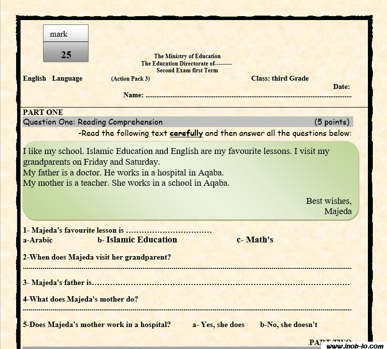 نموذج Word امتحان الشهر الثاني لمادة اللغة الإنجليزية للصف الثالث الفصل الأول