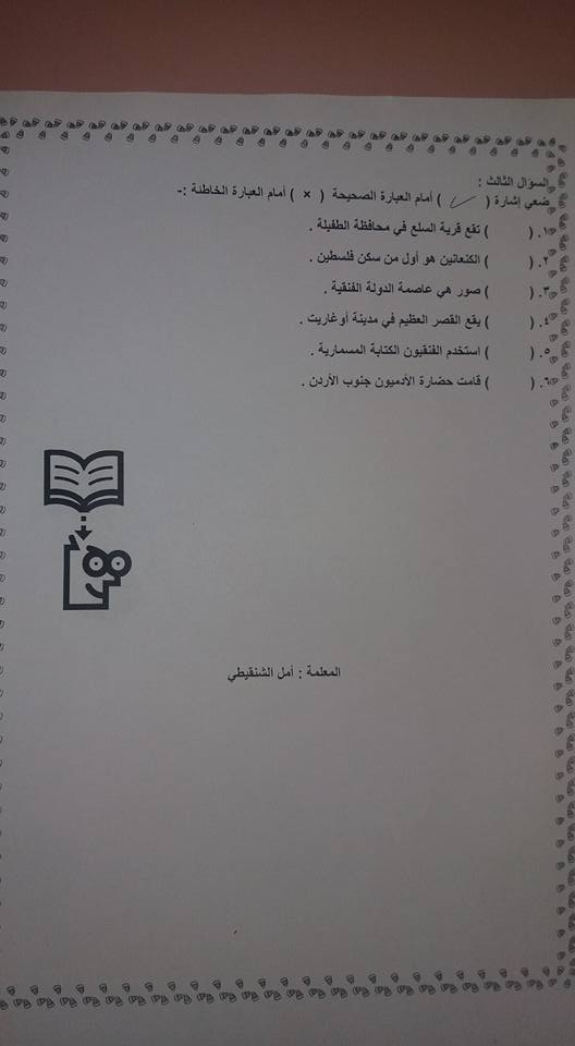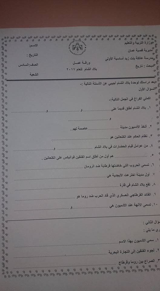 ورقه عمل وحدة: حضارات بلاد الشام لمادة التاريخ للصف السادس الفصل الأول
