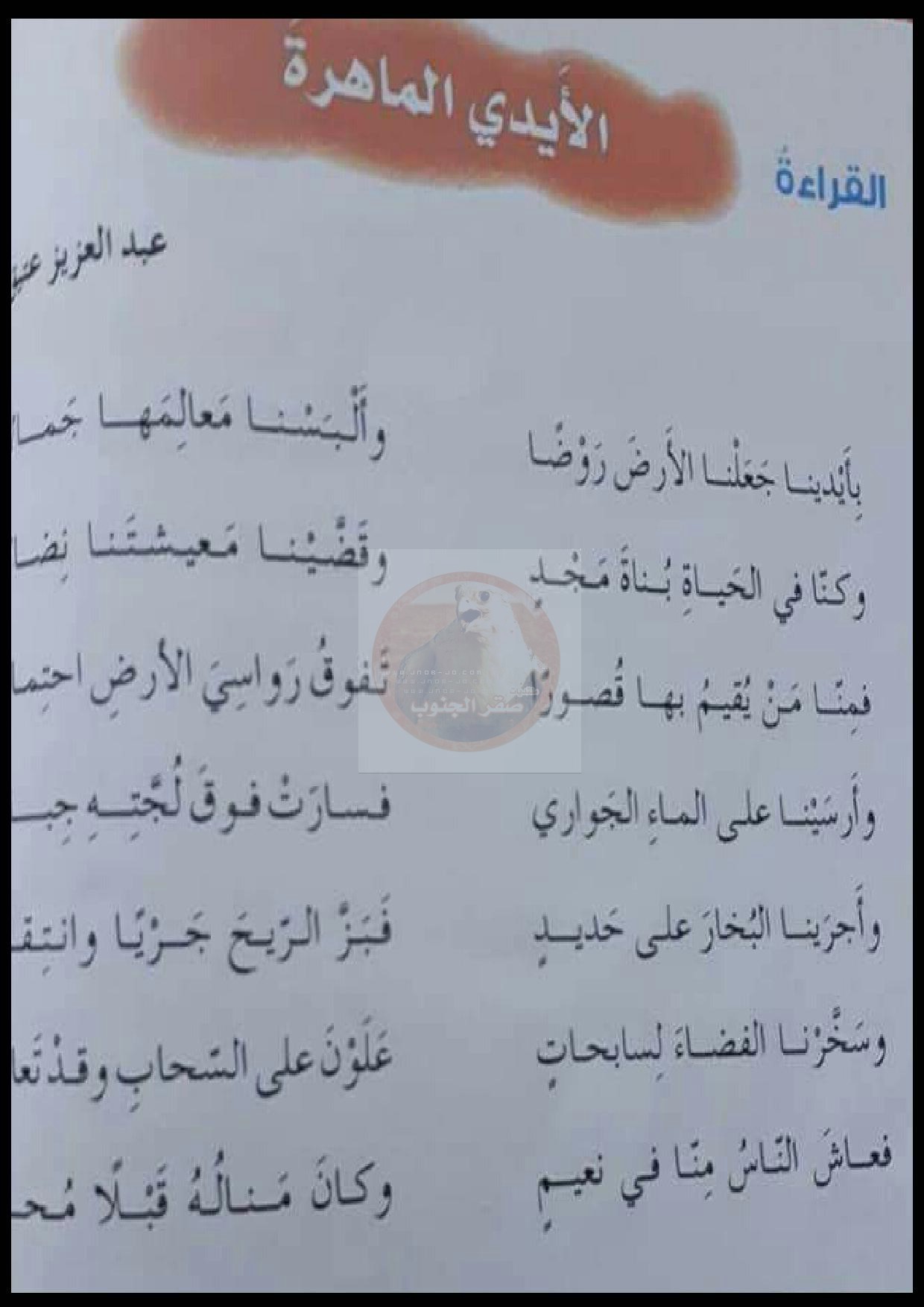 بالصور شرح قصيدة الايادي الماهرة لمادة اللغة العربية الصف السابع الفصل الاول