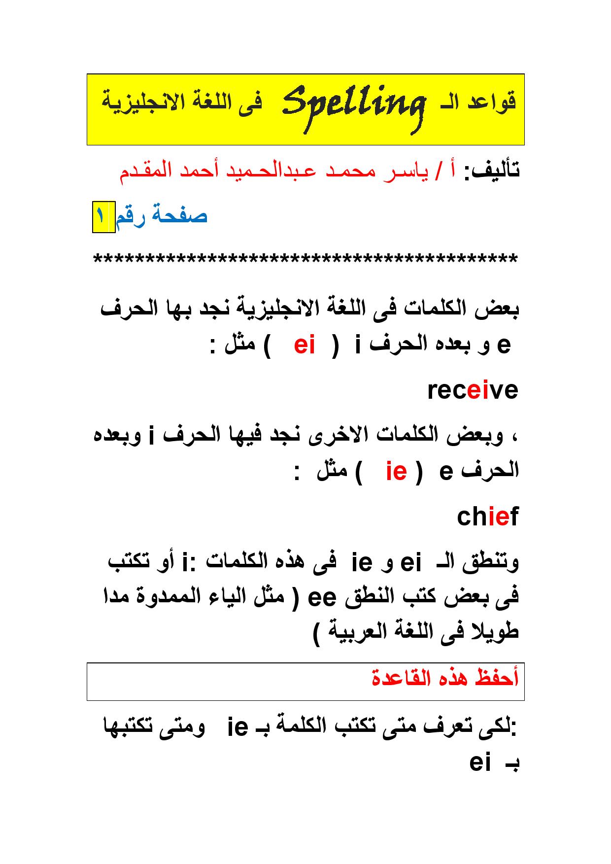 بالصور + ملف PDF يحتوي على اكثر من 33 صفحة شرح عن . قواعد الـ Spelling فى اللغة الانجليزية - على شكل شيتات