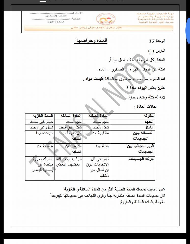 PDF تلخيص شامل للوحدة الخامسة لمادة العلوم الصف السادس الفصل الاول