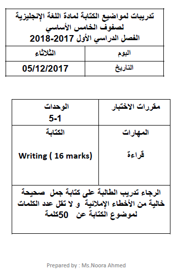 تدريبات لمواضيع الكتابة لمادة اللغة الإنجليزية الصف الخامس الفصل الاول