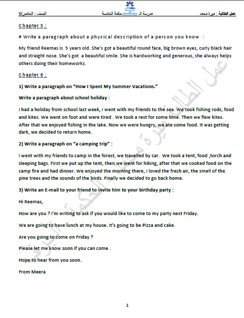 مواضيع كتابة لغة إنجليزية جميع الوحدات للصف الخامس الفصل الاول