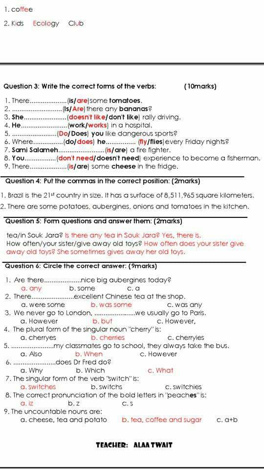 صور :. نموذج مع الإجابة النموذجية :الامتحان النهائي لمادة اللغة الإنجليزية للصف السابع الفصل الأول