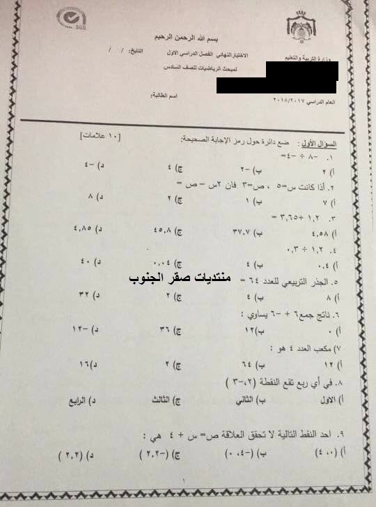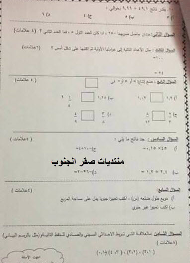 بالصور :. نموذج جديد : الاختبار النهائي لمادة الرياضيات للصف السادس الفصل الأول 2017