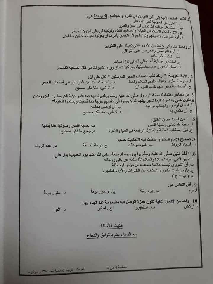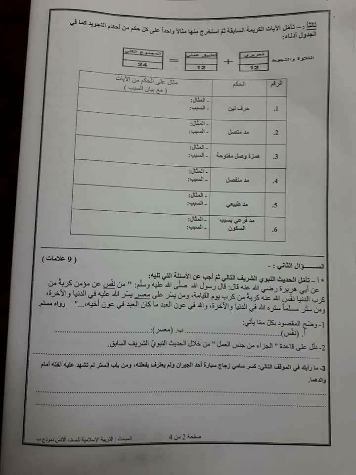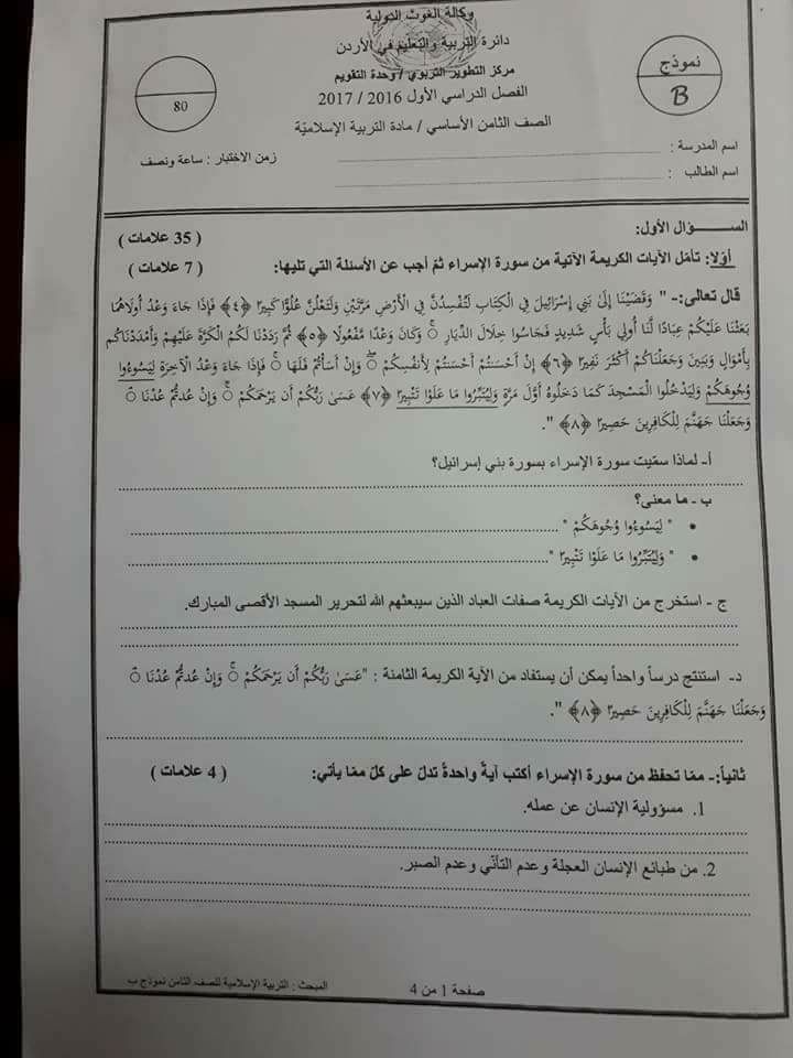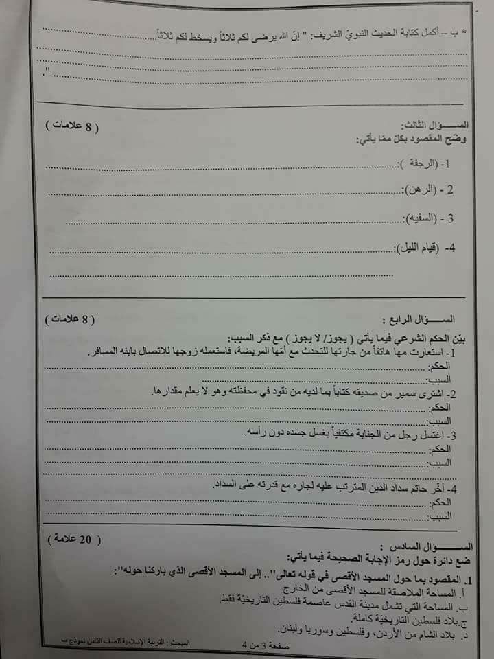نموذج :الاختبار النهائي لمادة التربية الإسلامية للصف الثامن الفصل الأول