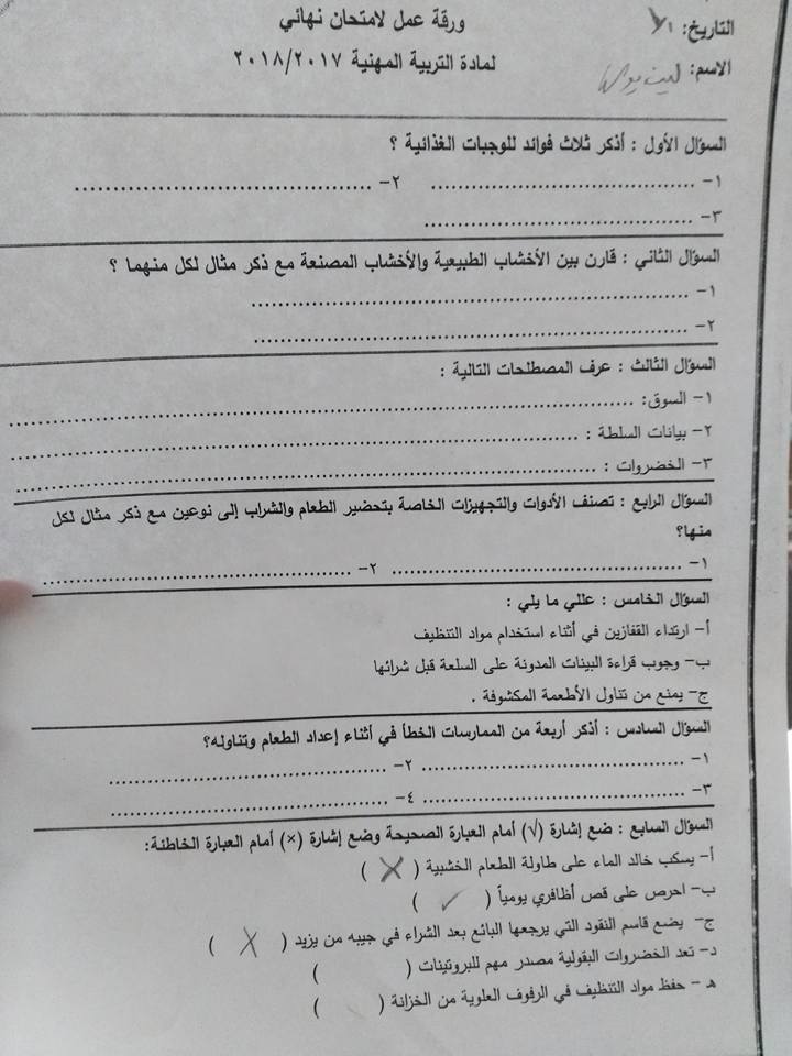 نموذج تدريبي:الاختبار النهائي لمادة التربية المهنية للصف الرابع الفصل الأول