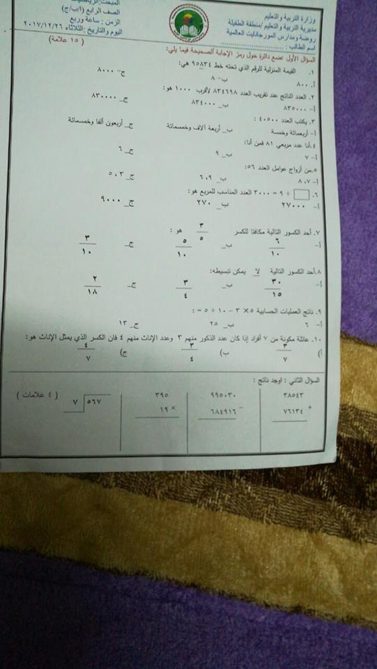 نماذج :الاختبار النهائي لمادة الرياضيات للصف الرابع الفصل الأول