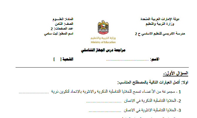 مراجعة درس الجهاز التناسلي لمادة العلوم الصف الثامن الفصل الثاني