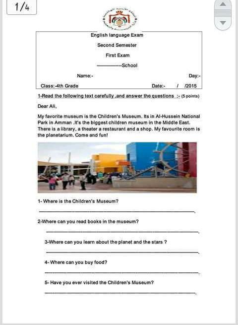 بالصور نماذج امتحانات الشهر الأول لمواد الصف الرابع الفصل الثاني