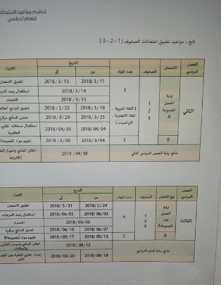 بالصور مواعيد تطبيق الامتحانات لصفوف 1 2 3 للفصل الثاني 2017-2018