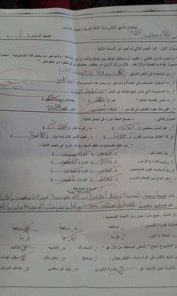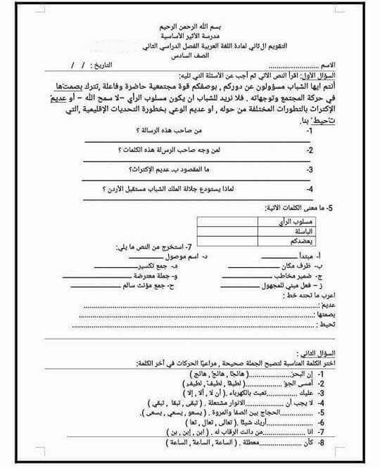 بالصور نموذج لاختبار الشهر الثاني لمادة اللغة العربية للصف السادس الفصل الثاني