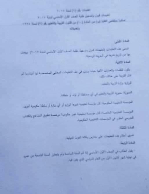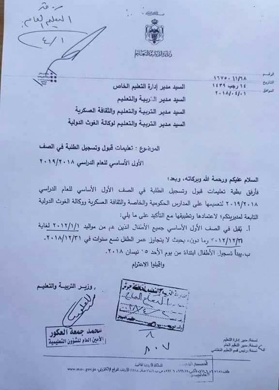 بالصور :. تعليمات وأسس قبول طلبة الصف الأول الأساسي للعام القادم 2018-2019