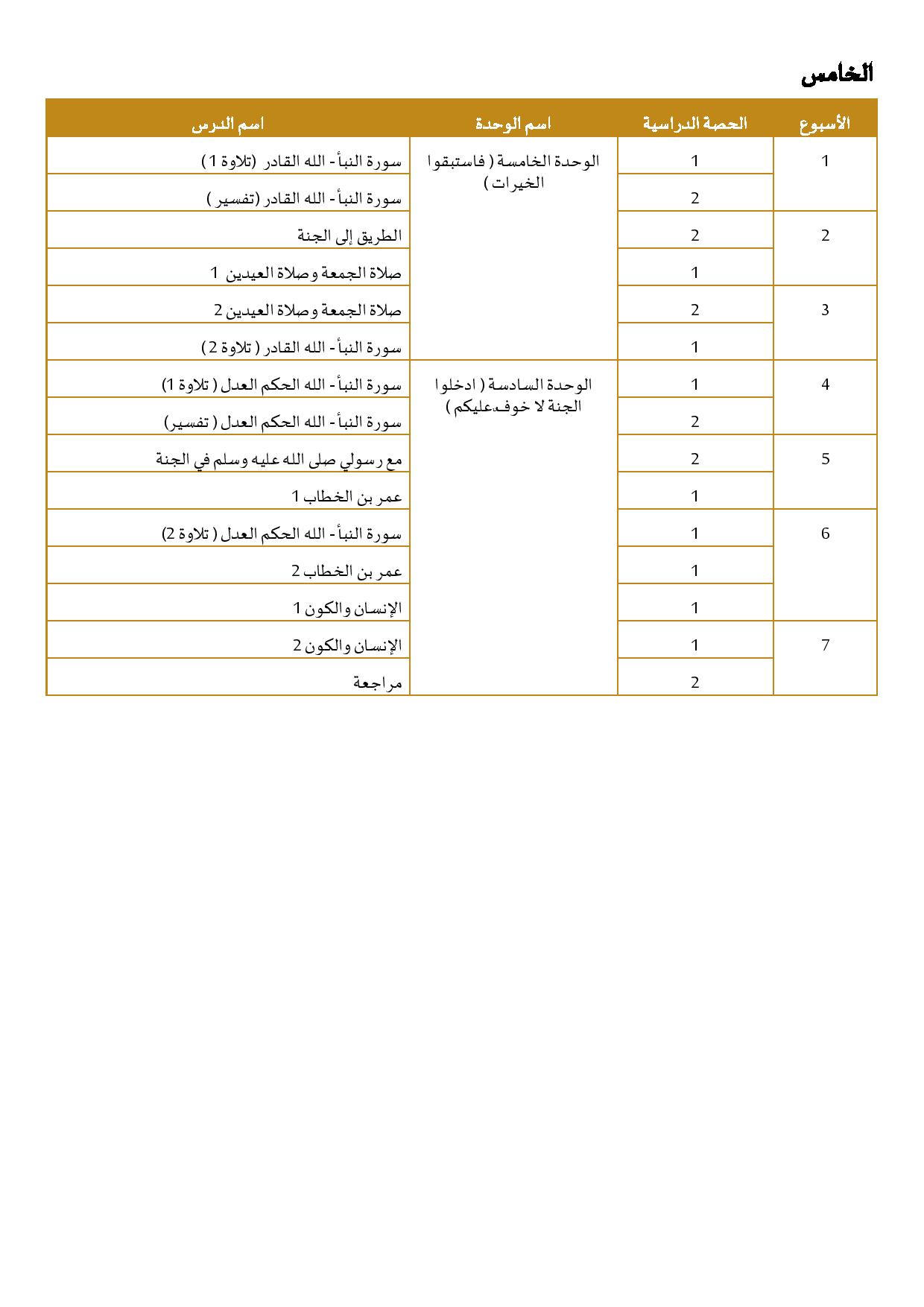 التوزيع الزمني للخطة الفصلية لمادة التربية الاسلامية الصف الخامس الفصل الثالث