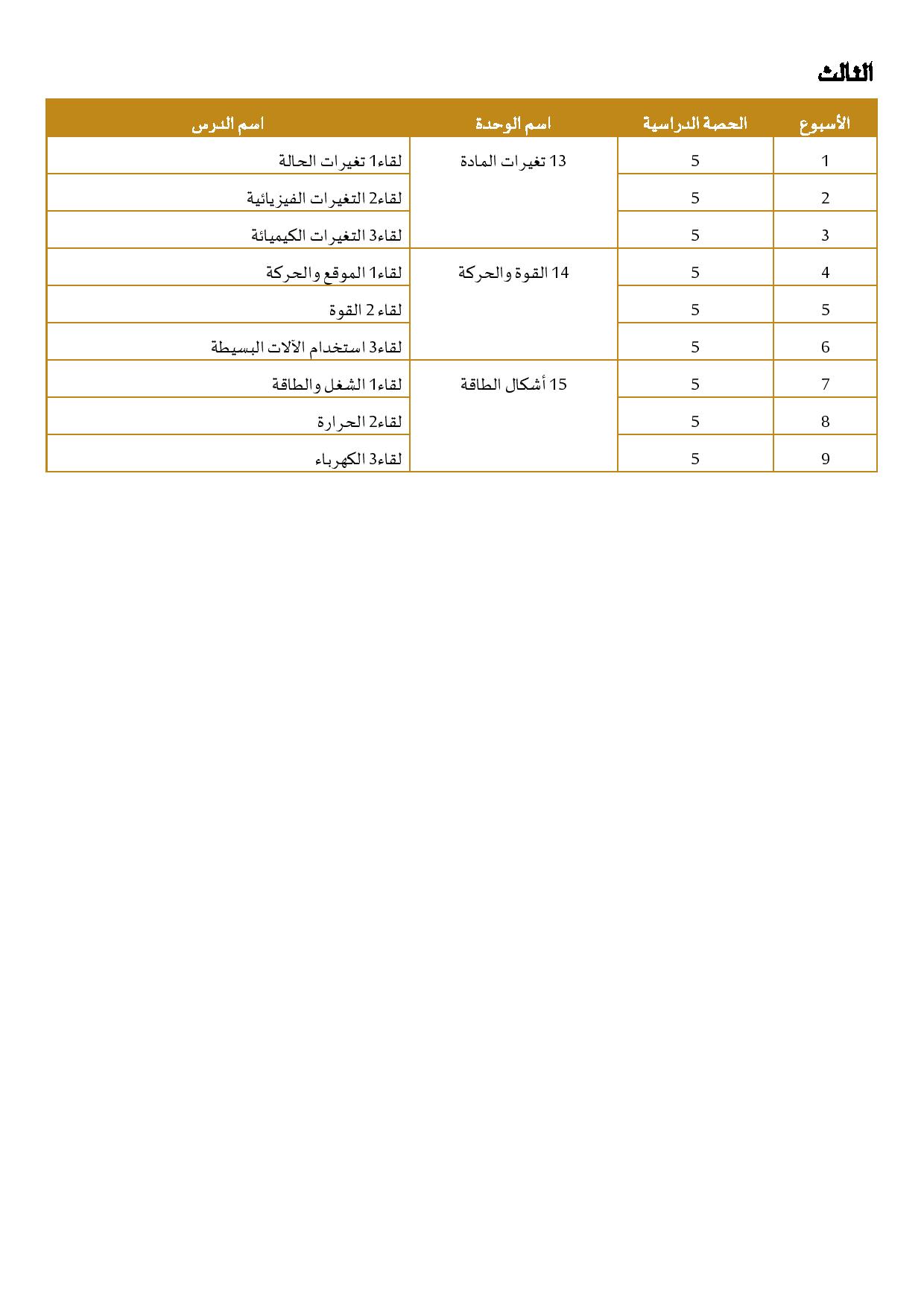التوزيع الزمني للخطة الفصلية لمادة العلوم الصف الثالث الفصل الثالث
