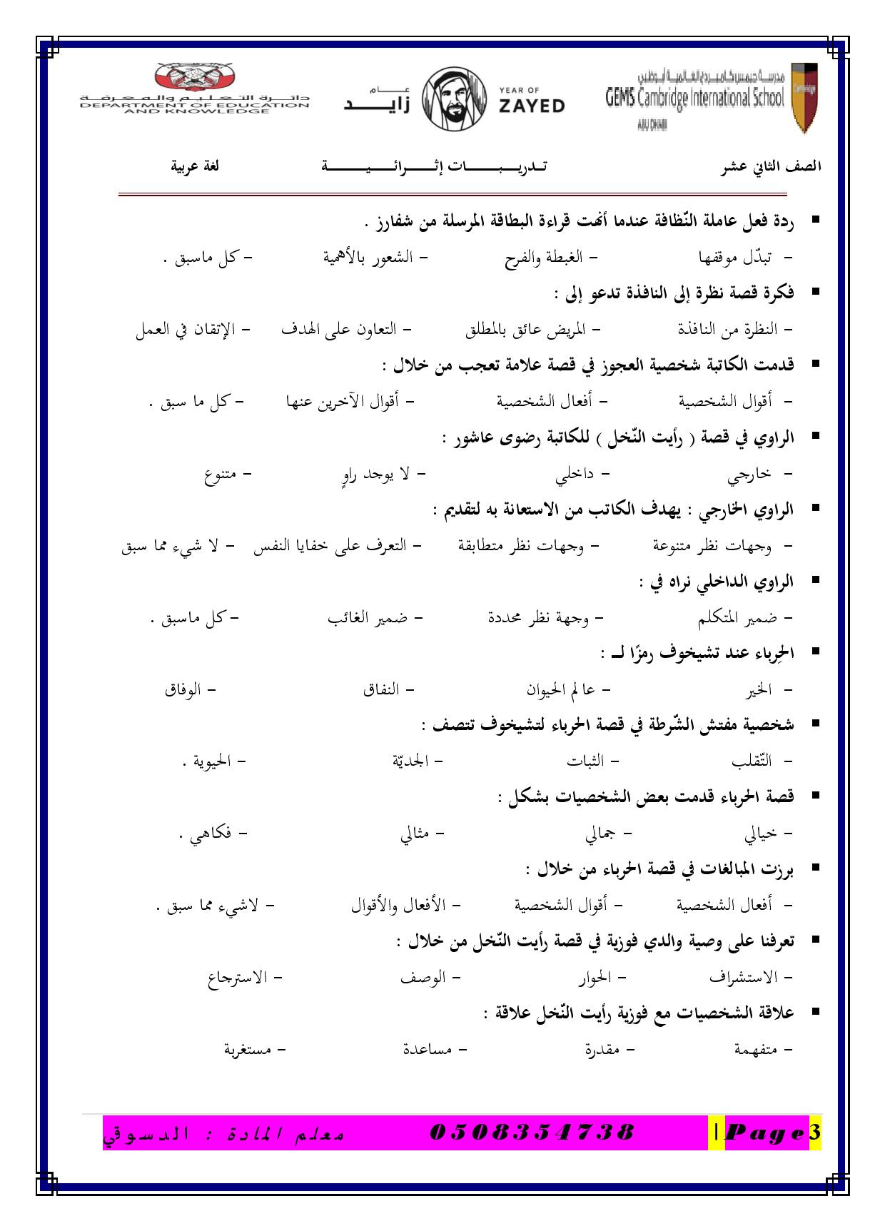 تدريبات إثرائية لمادة اللغة العربية للصف الثاني عشر الفصل الثالث