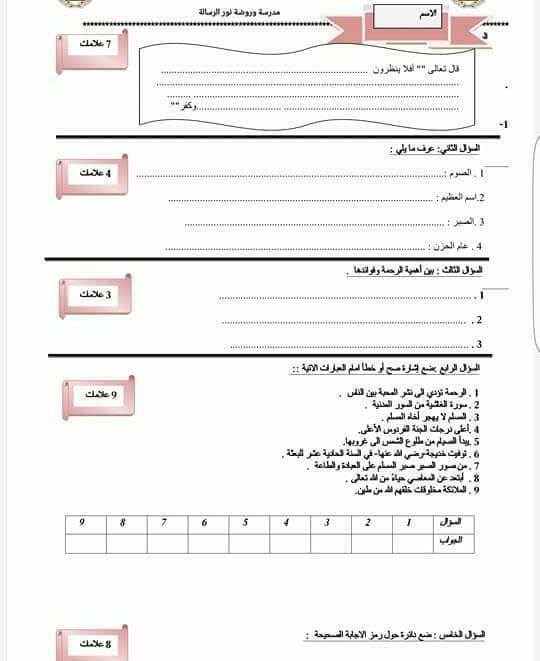 بالصور :الاختبار النهائي لمادة التربية الإسلامية للصف الرابع الفصل الثاني