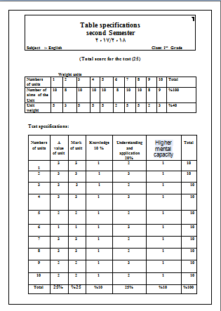 نموذج Word جدول مواصفات الإمتحان النهائي لمادة اللغة الإنجليزية الصف الاول الفصل الثاني لتحميل الملف Word اضغط هنا وتابع