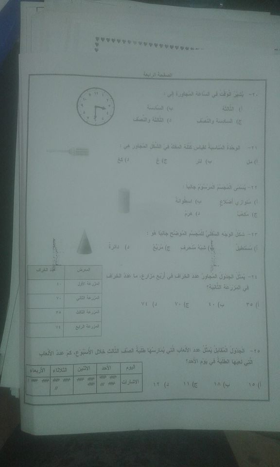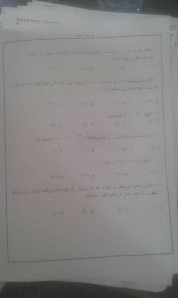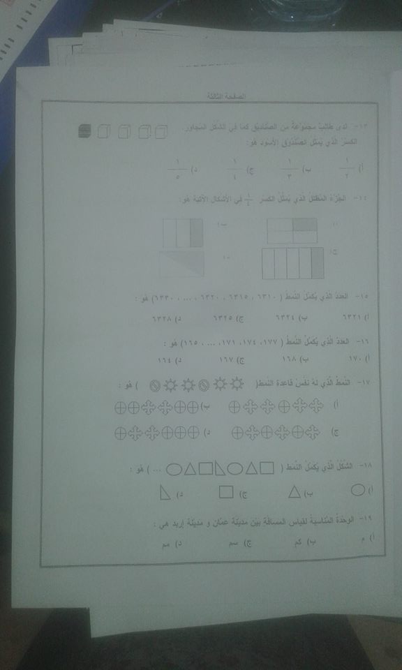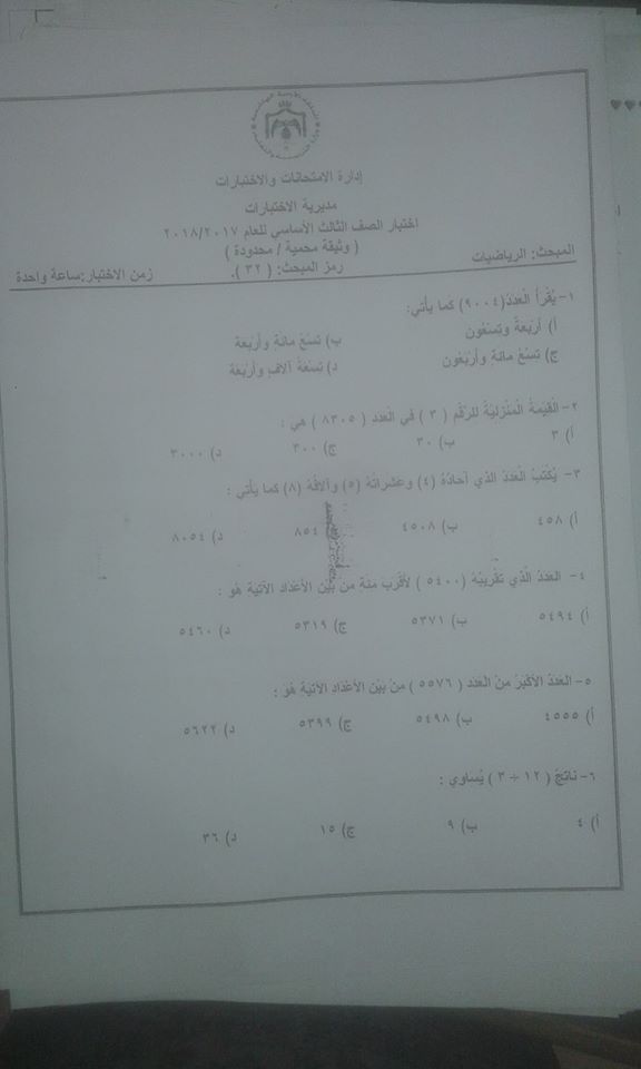 اختبار ضبط النوعية "الرياضيات "للصف الثالث