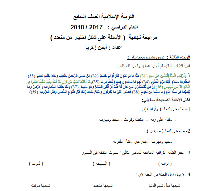 مراجعة نهائية لمادة التربية الإسلامية ( الأسئلة على شكل اختيار من متعدد ) الصف السابع الفصل الثالث التحميل الملف PDF اضغط هنا وتابع