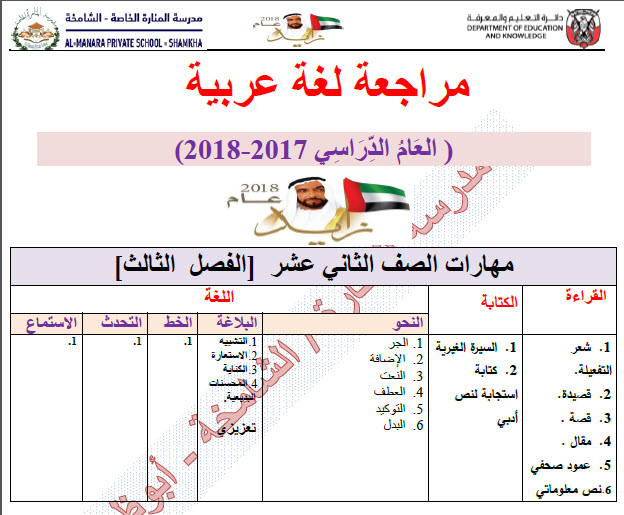 أوراق عمل مراجعة (المهارات) لمادة اللغة العربية للصف الثاني عشر الفصل الثالث