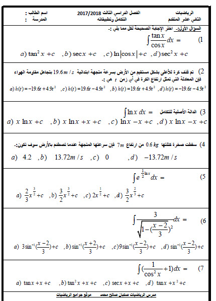 نموذج اختبار الكتروني 2 اختيار من متعدد لمادة الرياضيات الصف الثاني عشر الفصل الثالث 2018