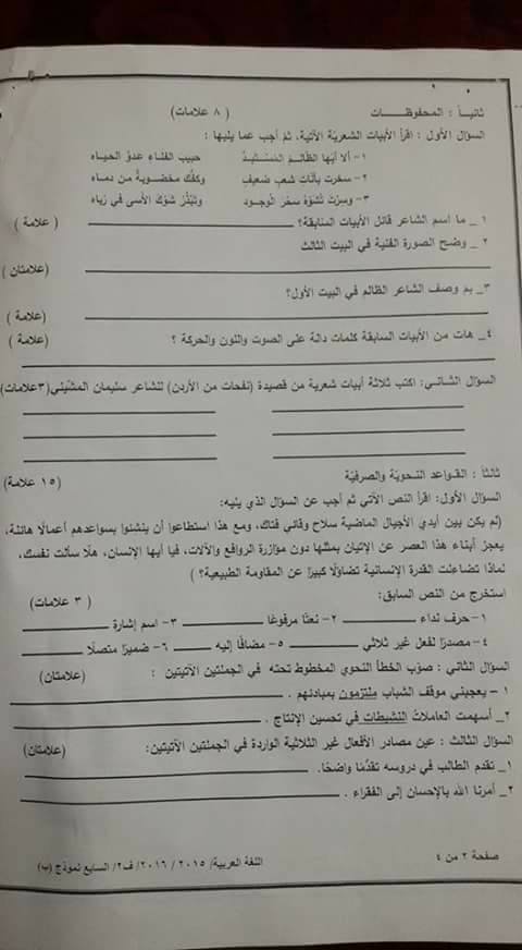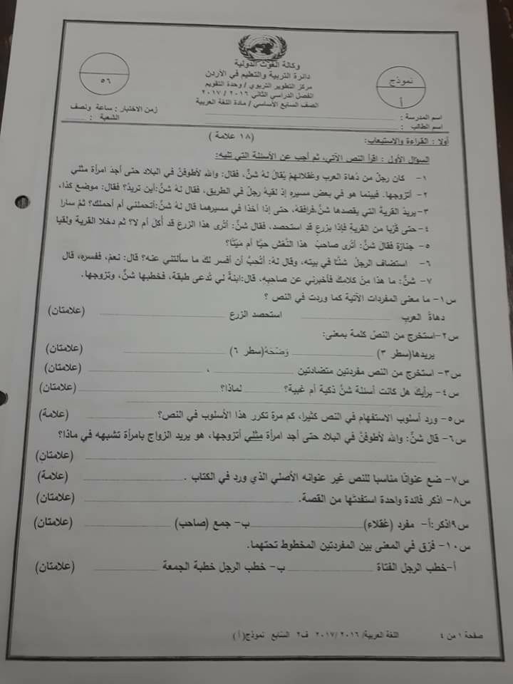 نماذج وكالة :الاختبار النهائي لمادة اللغة العربية للصف السابع الفصل الثاني لسنوات سابقة