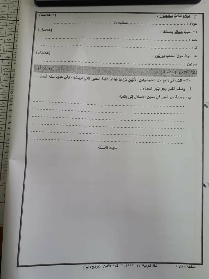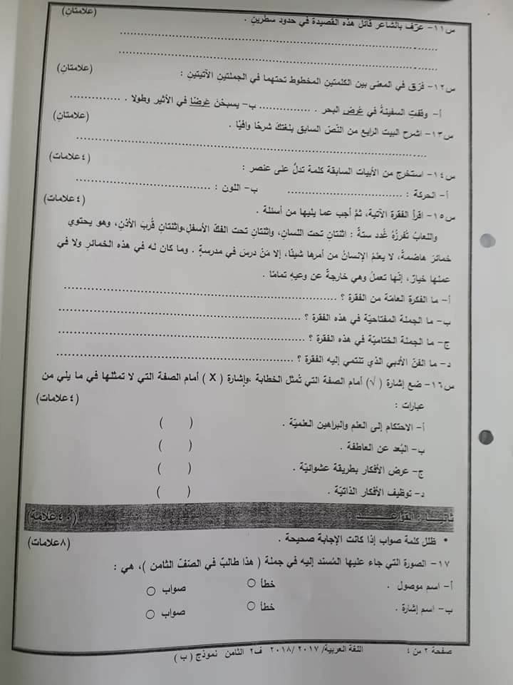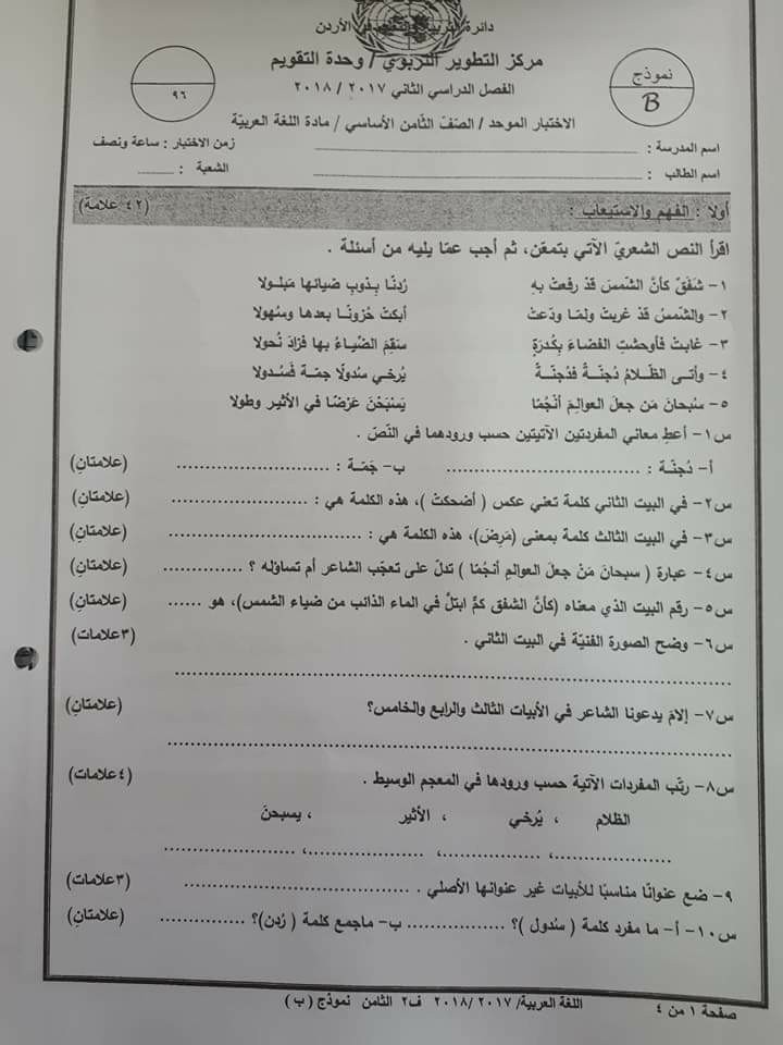 بالصور :. الاختبار النهائي -وكالة - B -لمادة اللغة العربية للصف الثامن الفصل الثاني