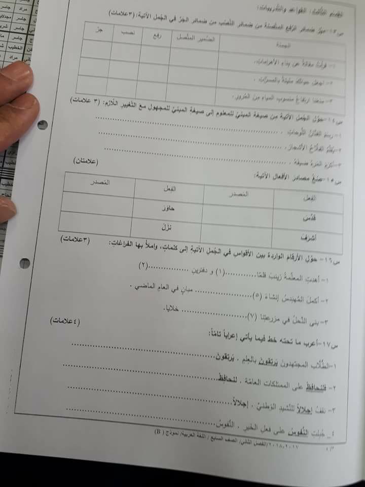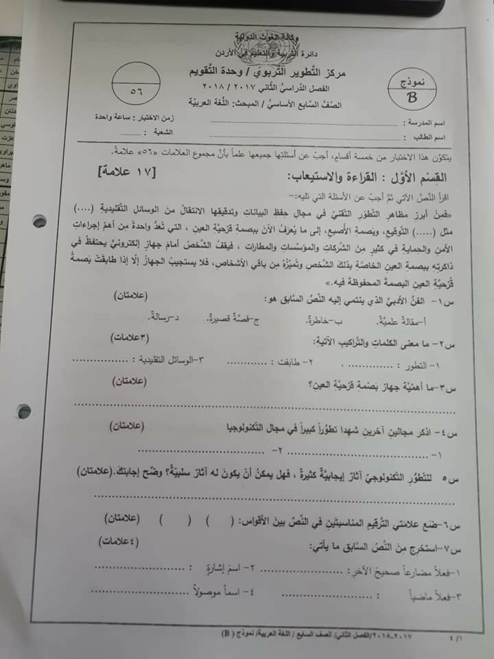 بالصور :. الاختبار النهائي -وكالة- B -لمادة اللغة العربية للصف السابع الفصل الثاني