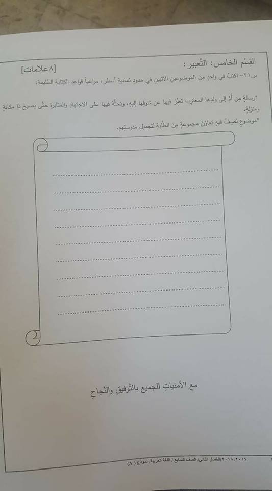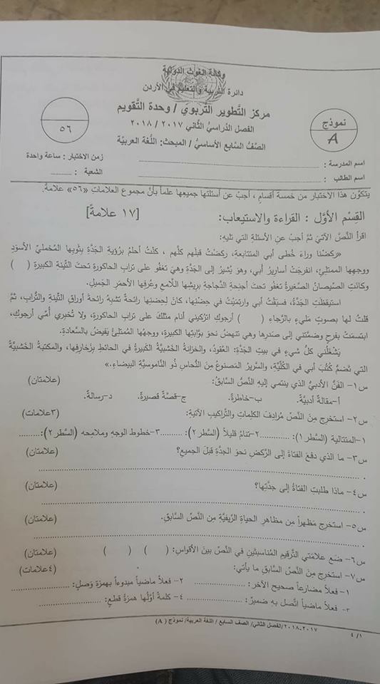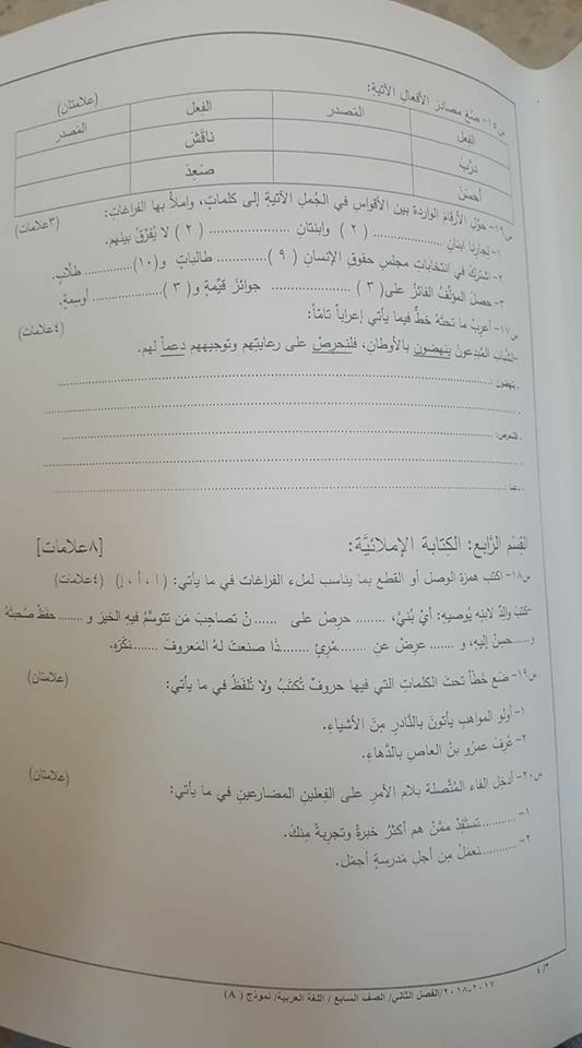 بالصور:الاختبار النهائي -وكالة-A -لمادة اللغة العربية للصف السابع الفصل الثاني