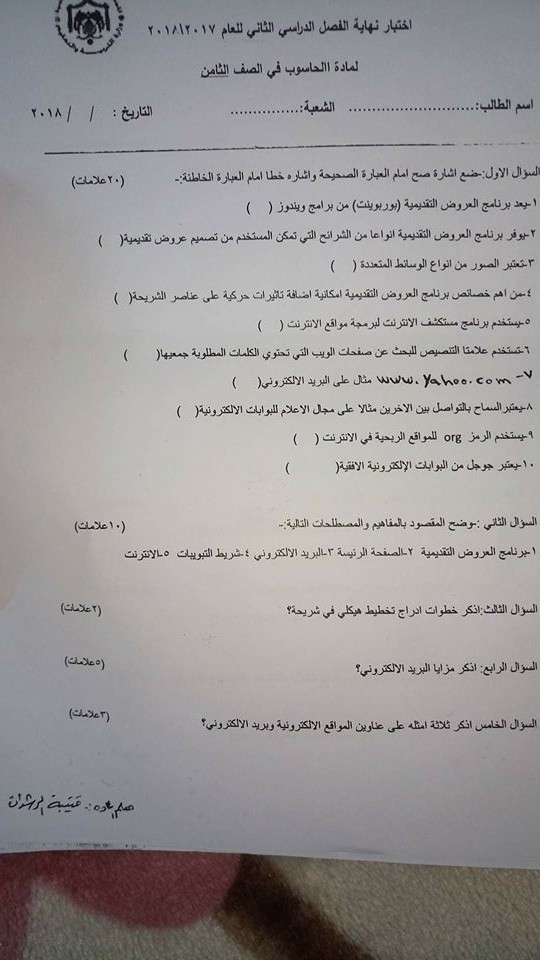 الاختبار النهائي لمادة الحاسوب الصف الثامن الفصل الثاني قابل للتعديل word نموذج 2