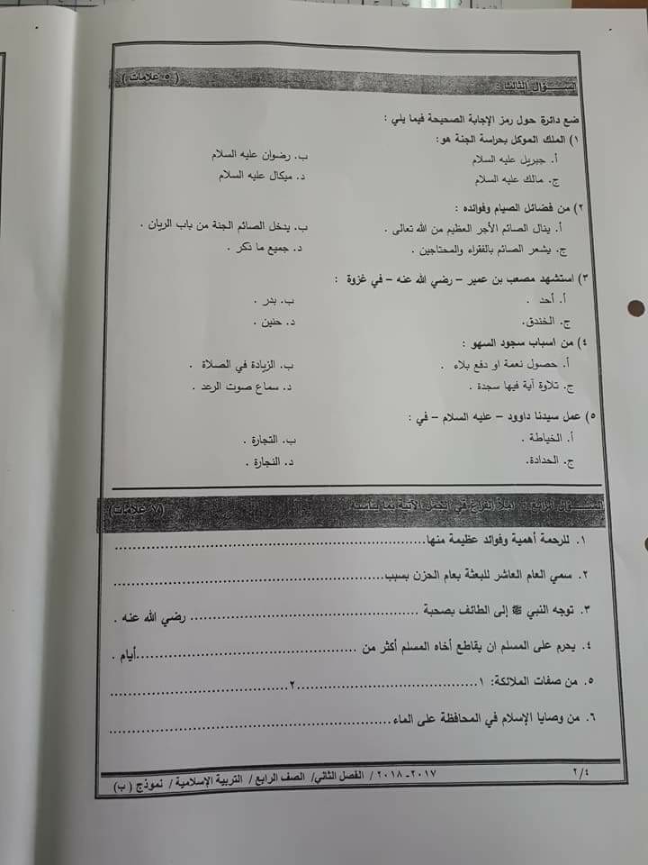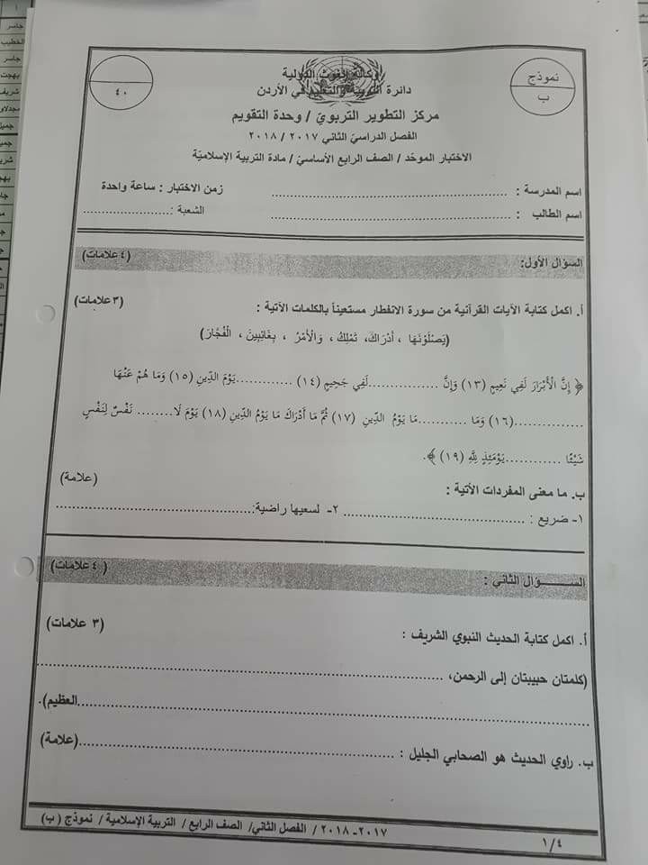بالصور:الاختبار النهائي -وكالة-B -لمادة التربية الإسلامية للصف الرابع الفصل الثاني