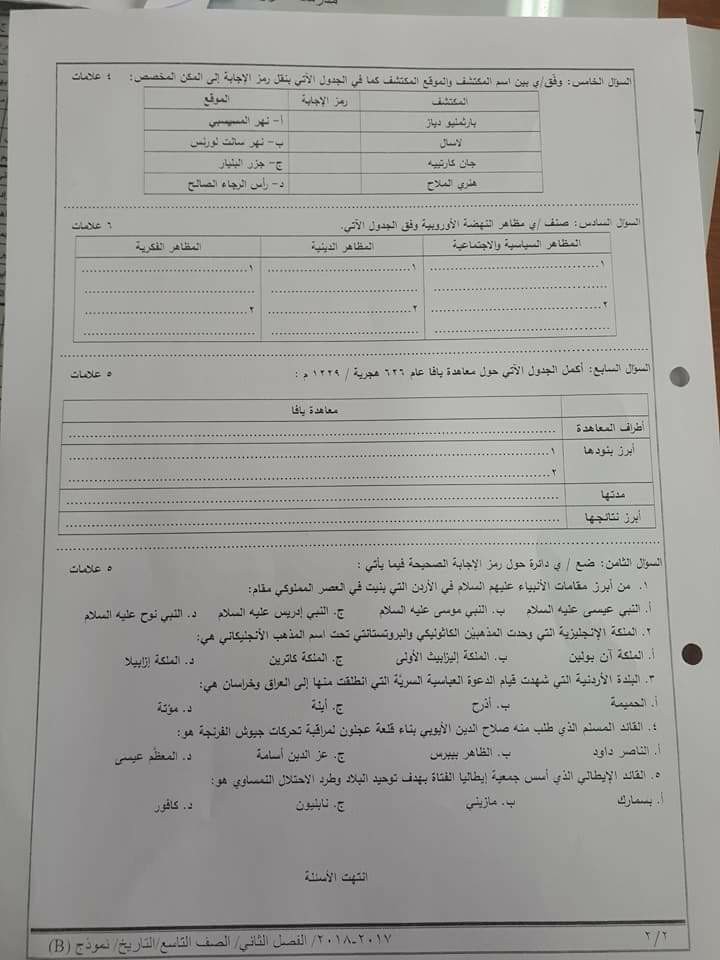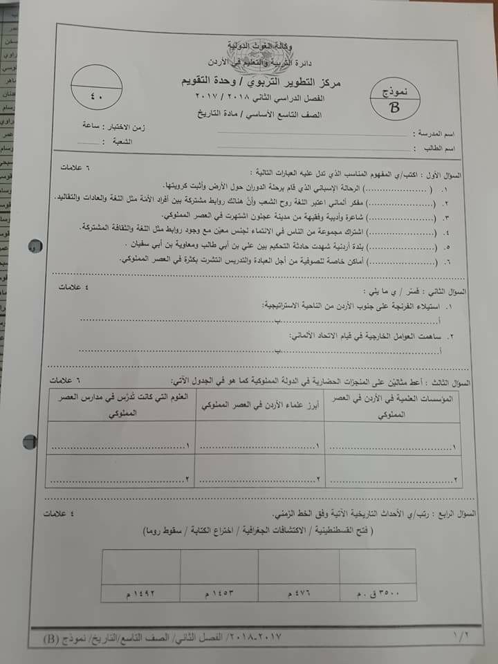 بالصور : الاختبار النهائي -وكالة-B -لمادة التاريخ للصف التاسع الفصل الثاني