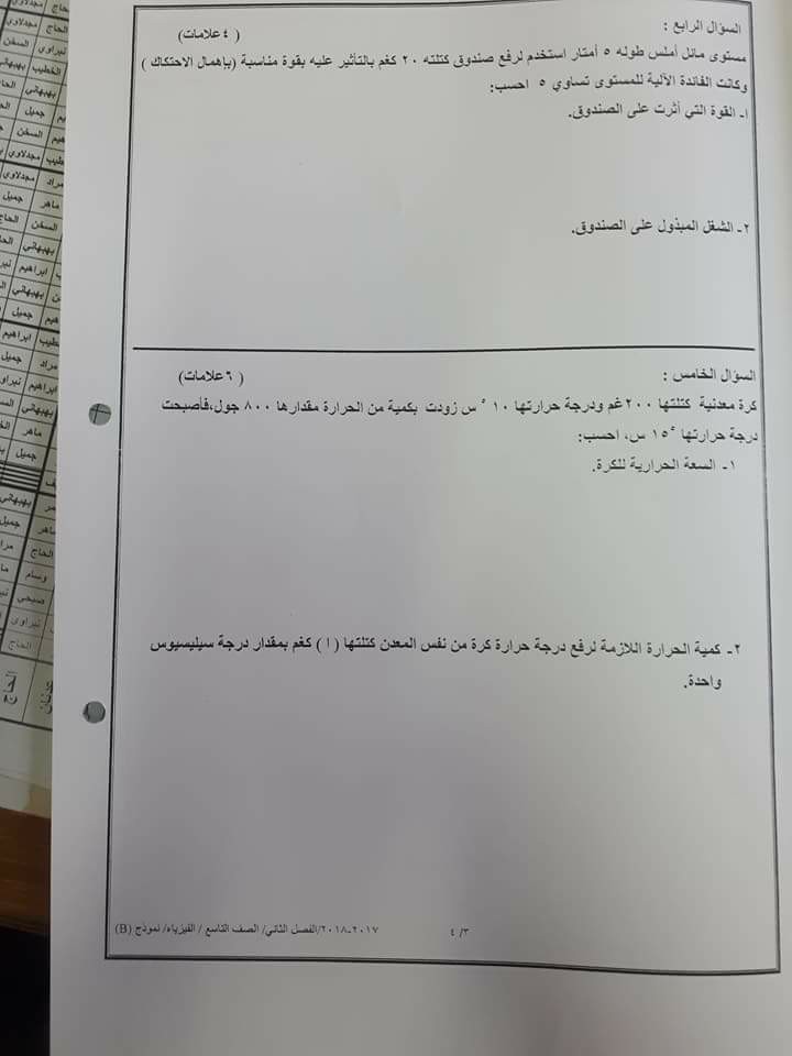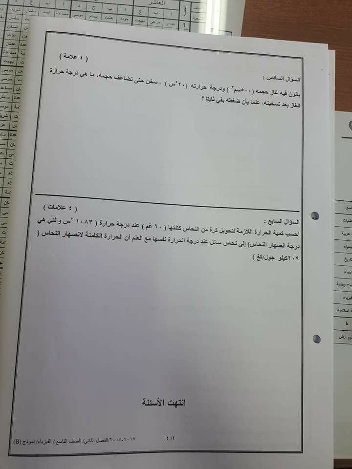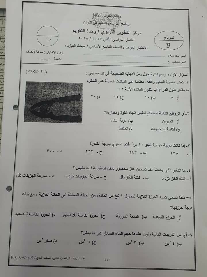 بالصور:الاختبار النهائي -وكالة-B -لمادة الفيزياء للصف التاسع الفصل الثاني