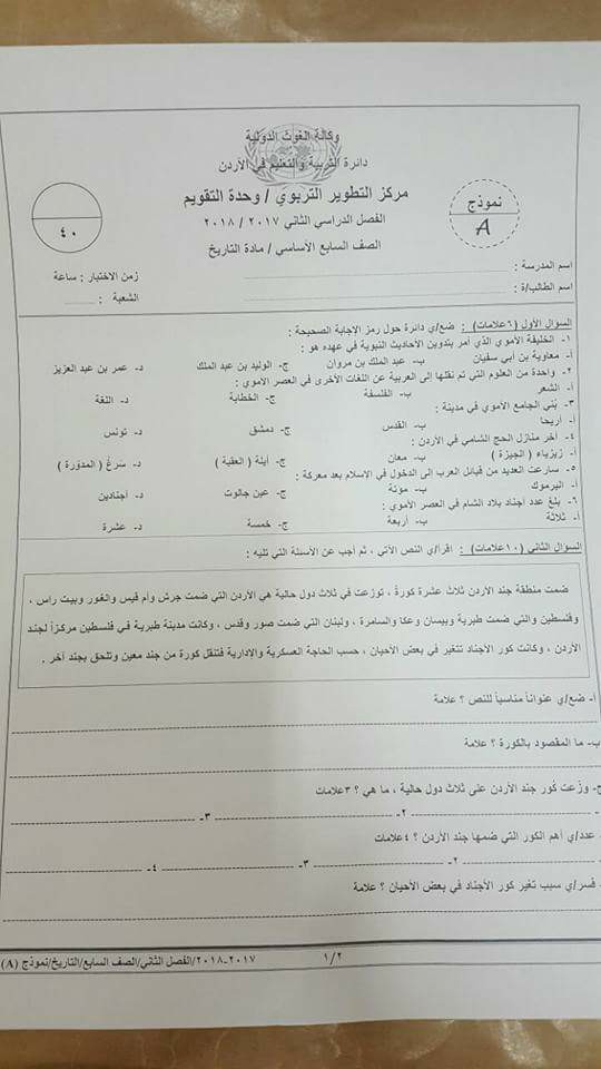 بالصور:الاختبار النهائي -وكالة-A -لمادة التاريخ للصف السابع الفصل الثاني
