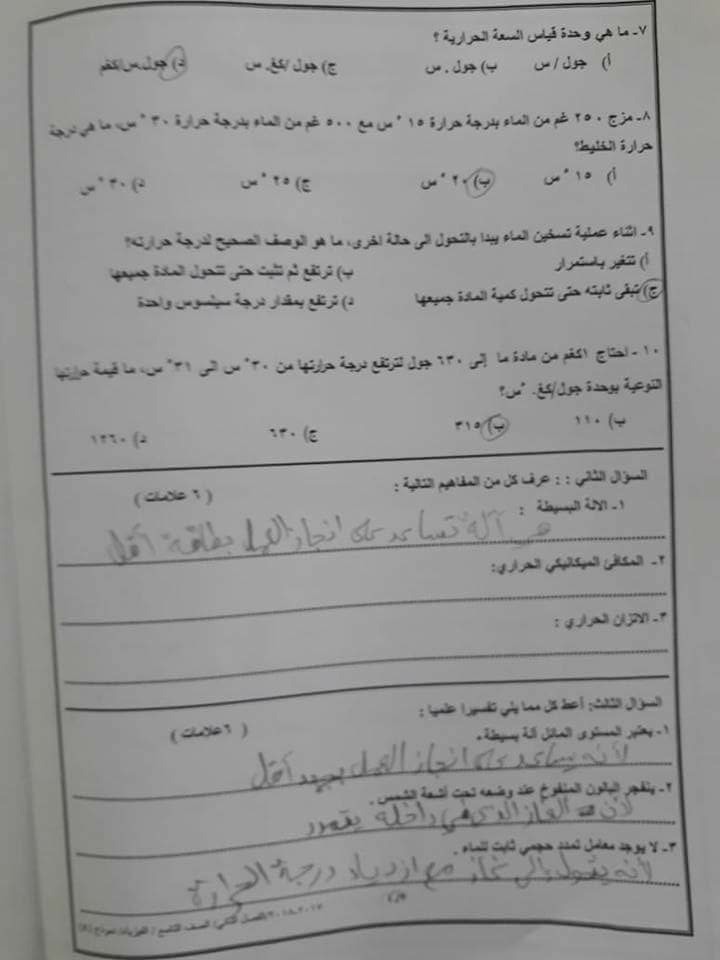 بالصور:الاختبار النهائي -وكالة-A -لمادة الفيزياء للصف التاسع الفصل الثاني