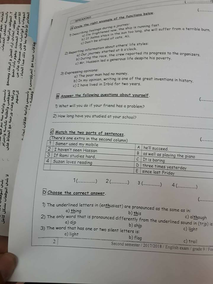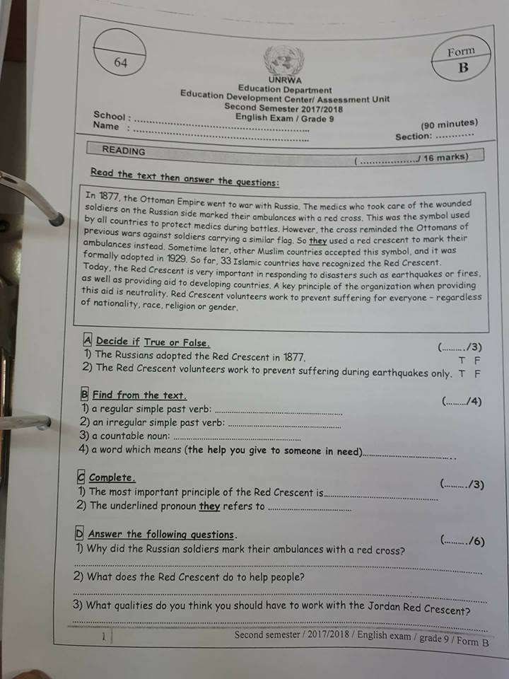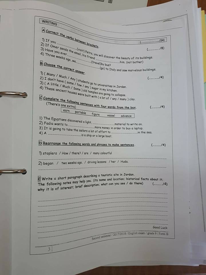 بالصور:الاختبار النهائي -وكالة-B -لمادة اللغة الإنجليزية للصف التاسع الفصل الثاني