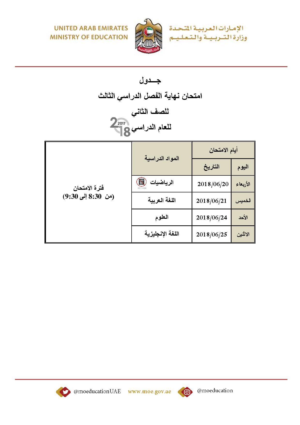 جدول امتحان نهاية الفصل الدراسي الثالث لجميع المواد الصف الثاني2017-2018 التحميل الملف PDF اضغط هنا وتابع