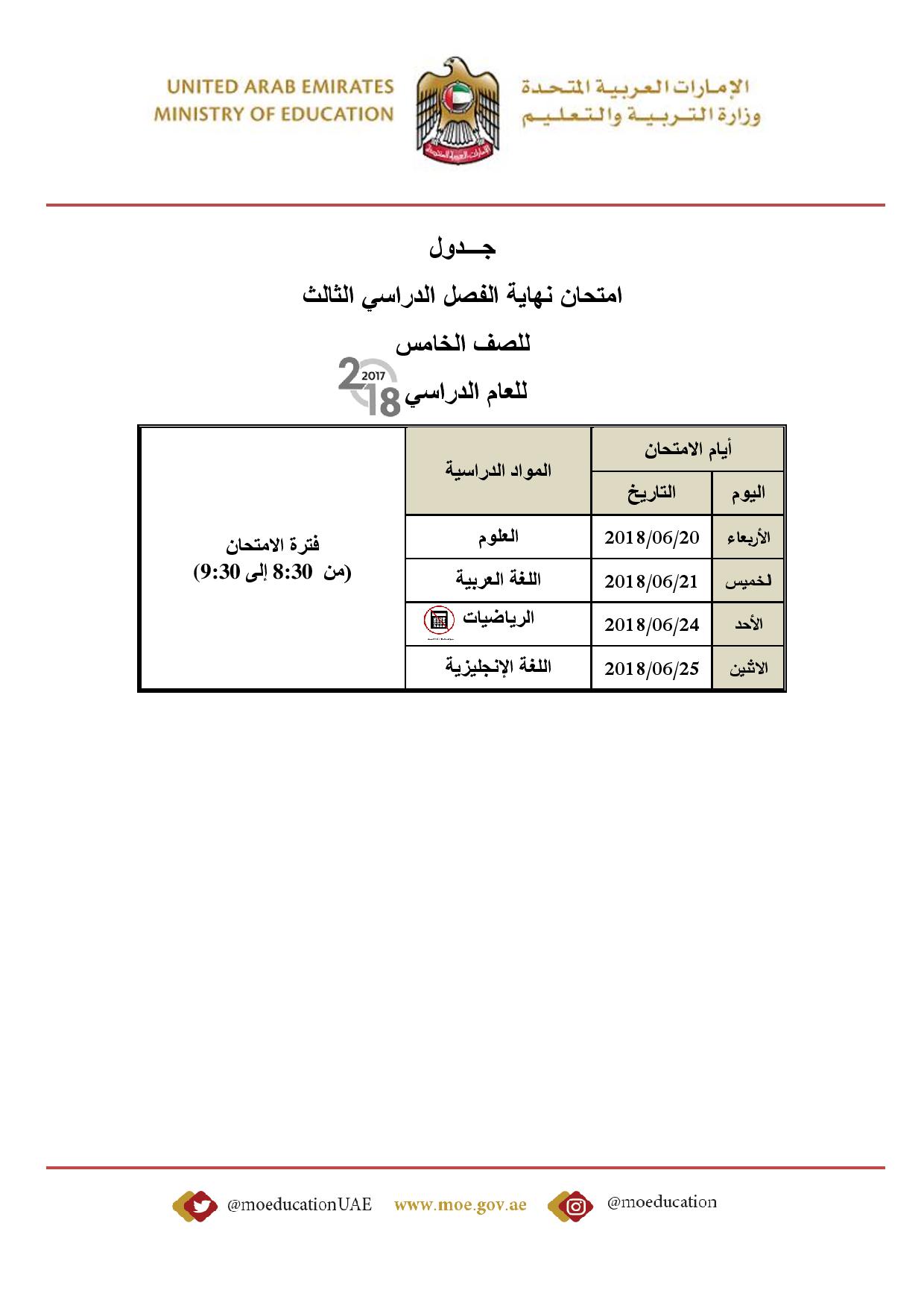 جدول امتحان نهاية الفصل الدراسي الثالث لجميع المواد الصف الخامس