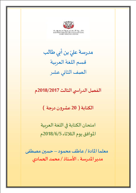 نموذج امتحان الكتابة في اللغة العربية للصف الثاني عشر الفصل الدراسي الثالث