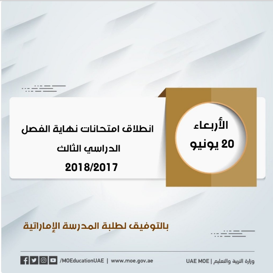 صرحت وزارة التربية والتعليم الاماراتية :. الأربعاء 20 يونيو موعد انطلاق امتحانات نهاية الفصل الدراسي الثالث للعام الدراسي 2017-2018