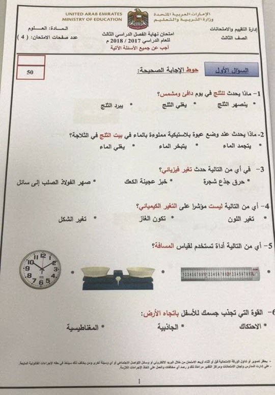 امتحان مادة العلوم للصف الثاني بتاريخ 20-06-2018 الفصل الثالث