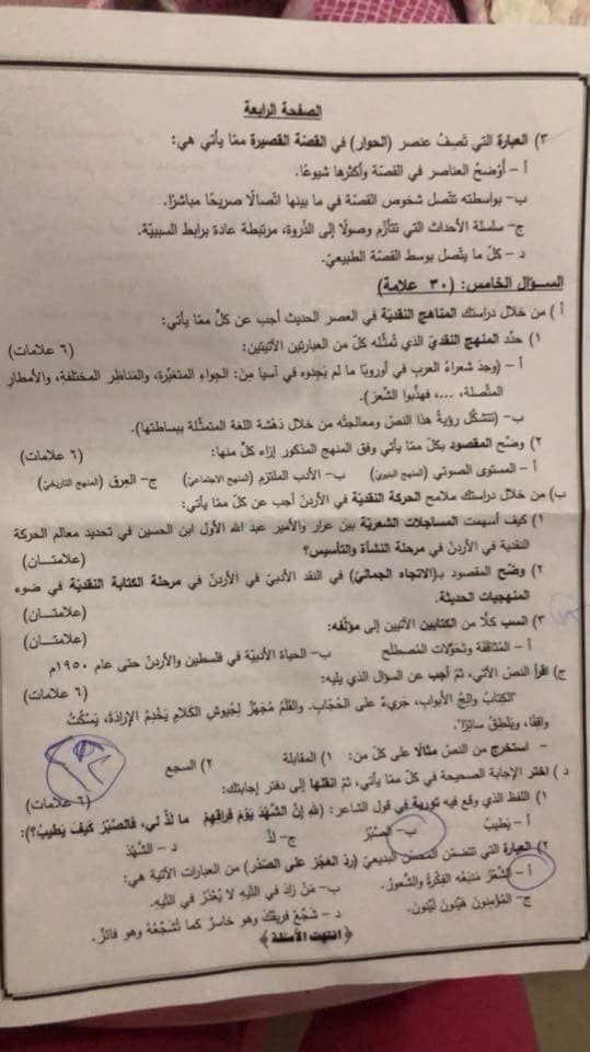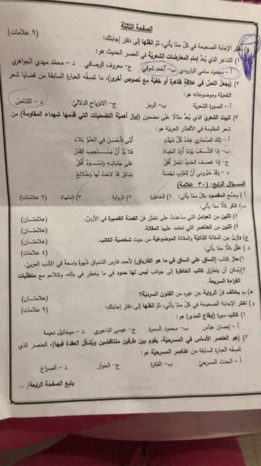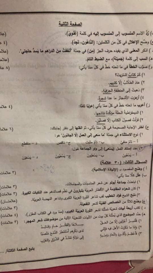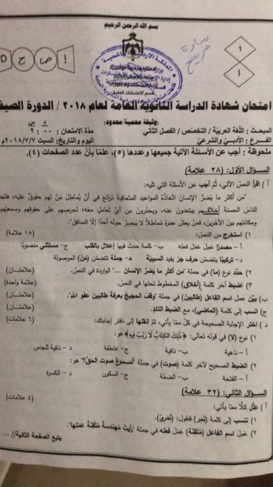 بالصور :. امتحان مادة اللغة العربية تخصص الفصل الثاني مع الحلول السبت الموافق 07-07-2018