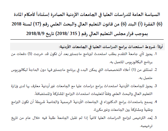 السياسة العامة للدراسات العليا في الجامعات الأردنية للعام الجامعي 2018-2019