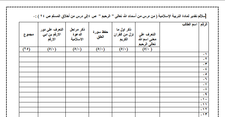 سلالم تقدير لمادة التربية الإسلامية للصف الثالث الفصل الأول لـــــتـــــحـــــمـــــيـــــل الـــــمـــــلـــــف اضـــــغـــــط هـــــنـــــا وتـــــابـــــع