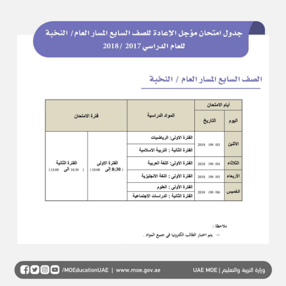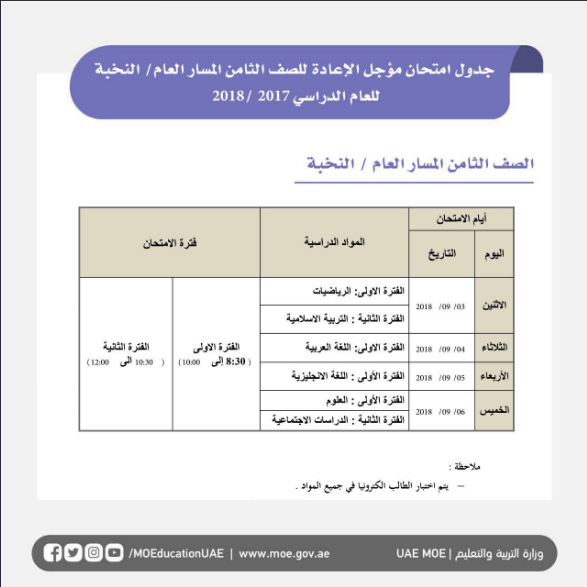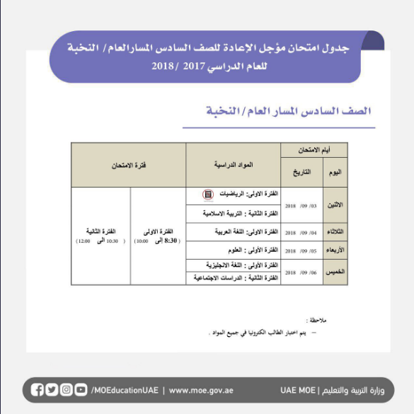 جدول امتحان مؤجل الإعادة للصفوف السادس والسابع والثامن المسار العام- النخبة العام الدراسي 2017-2018