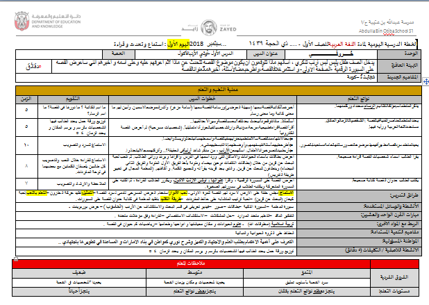 نموذج Word قابل للتعديل التحضير اليومي لمادة اللغة العربية (حرف الألف) للصف الأول الفصل الاول