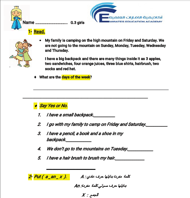 اللغة الإنجليزية ورقة عمل (unit 1 lesson 3.4.5) للصف الثالث الفصل الاول