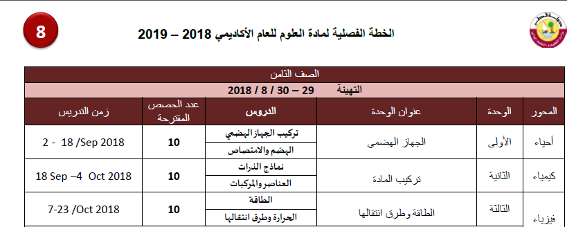 الخطه الفصليه لمادة العلوم لصف الثامن الفصل الأول المنهاج القطري 2018 - 2019